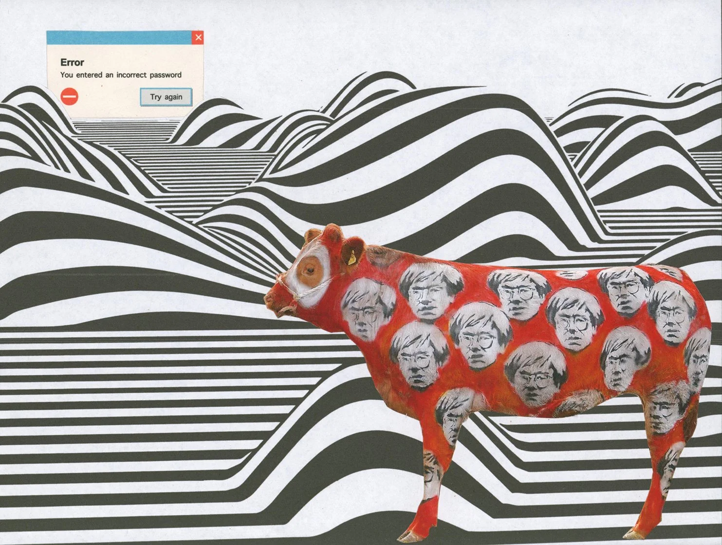 In Everything Repeats Itself, Hannah invites viewers into a dizzying landscape, marked by hypnotic optical illusions that bend perception and distort spatial logic. Here, repetition isn't merely a visual device, it symbolizes deeper cycles of behavior, culture, and emotional entrapment that define human experience. The addition of the cow which bears the repeated visage of Andy Warhol, the quintessential icon of mass-produced art (initially conceptualized by Banksy as a provocative statement on commodification) into her illusion paper landscape, Hannah confronts viewers with a layered commentary on authenticity, value, and the erasure of individuality through endless replication.