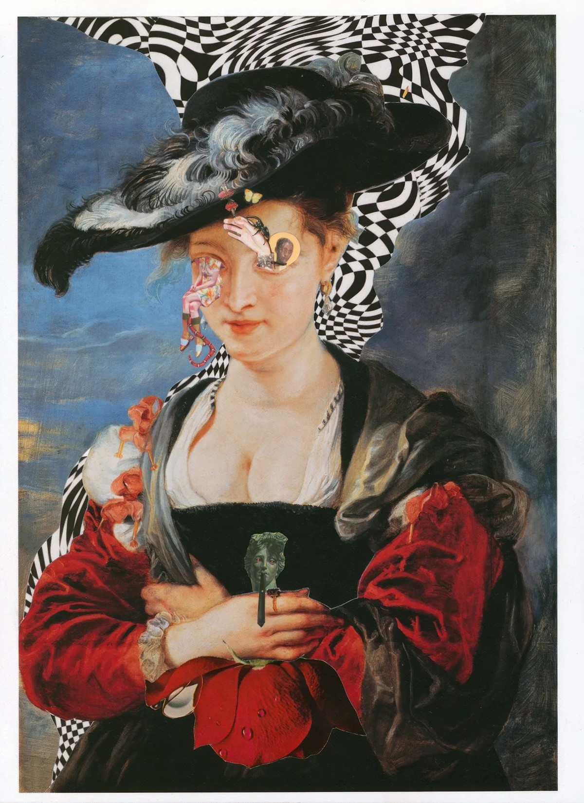 Eyes Wide Broken confronts the fragmented nature of perception, identity, and transformation. Hannah’s collage presents a figure whose very essence seems suspended between beauty and chaos, reality and illusion. In her right hand, she holds an inverted rose, its bloom replaced by the head of a statue with red, piercing eyes… a haunting echo of distorted ideals and imposed narratives.