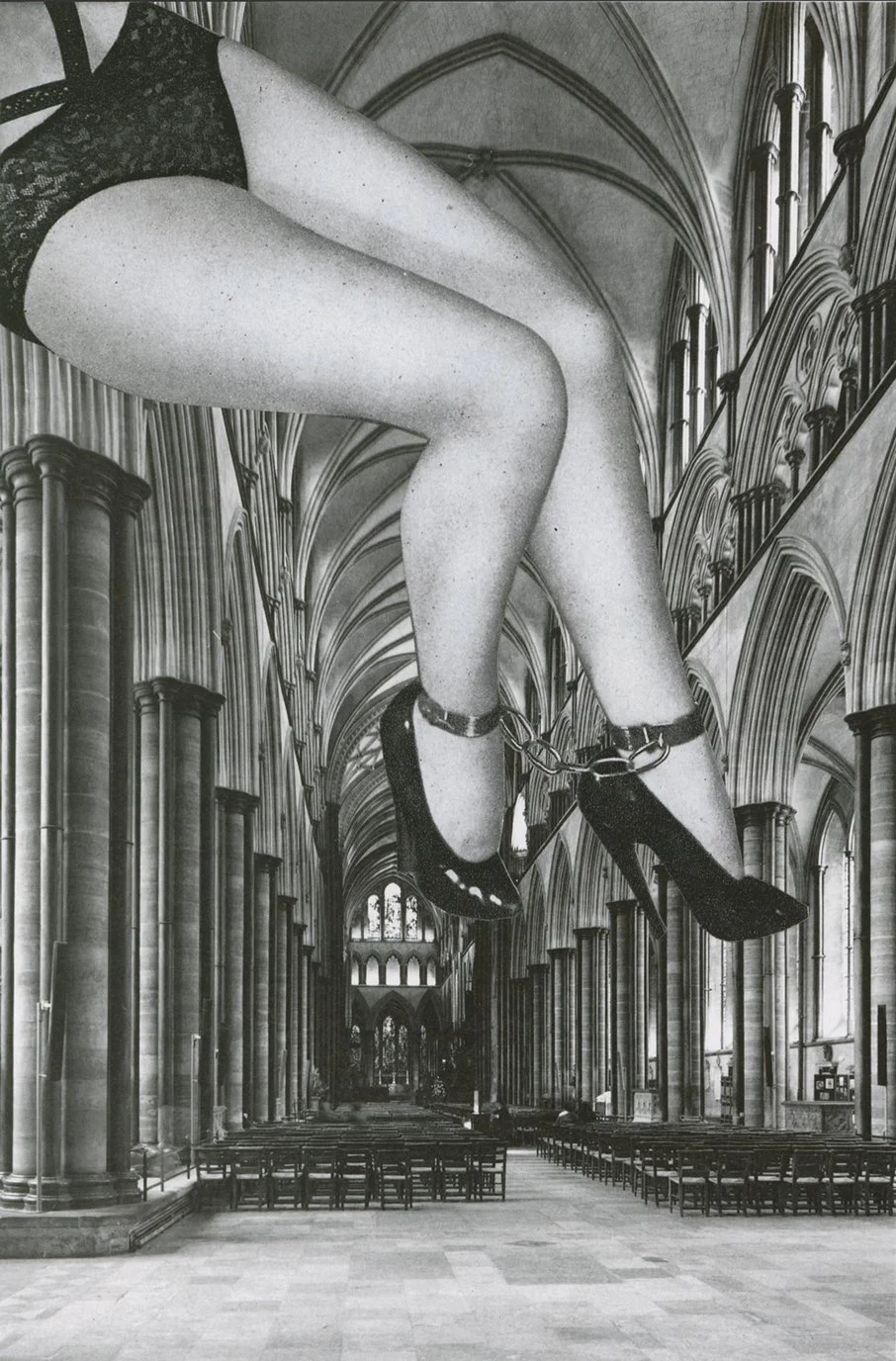The cathedral, traditionally a sanctuary of peace, reverence, and spiritual reflection, is here disrupted, violated even, by imagery typically relegated to the hidden corners of our collective subconscious. Through this bold visual intrusion, Hannah explores the hypocrisy embedded within institutions, religious or otherwise, that often preach purity while masking underlying tensions of desire, guilt, and judgment. The chained ankles, symbols of restraint and vulnerability, further emphasize this inner conflict between societal expectations and deeply buried human impulses.