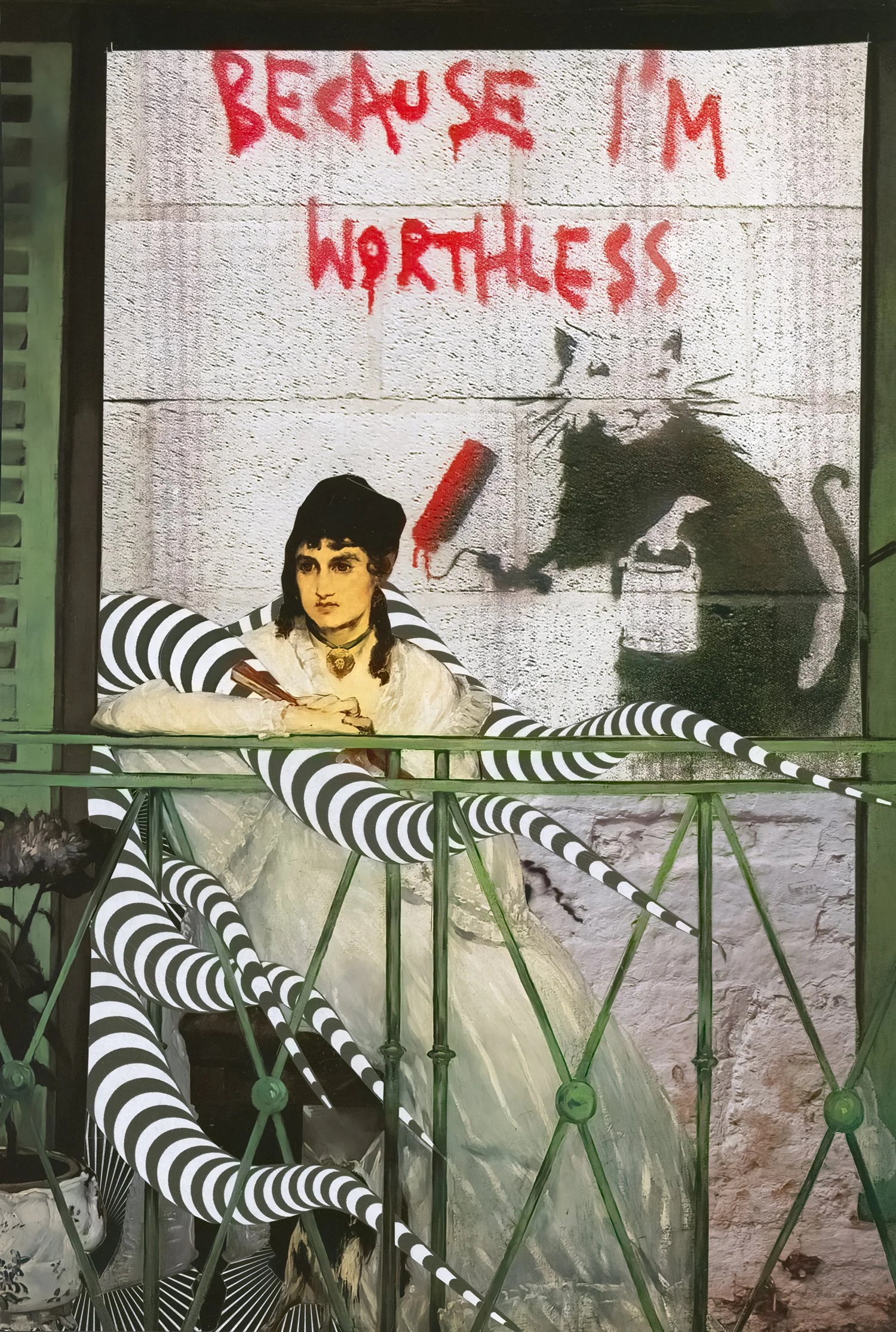 My Strange Balcony merges the classical with the contemporary, reflecting on isolation, self-perception, and societal pressures. Hannah reimagines a solitary woman from Édouard Manet’s The Balcony (1868), placing her behind a green balcony railing with a pensive gaze directed inward as much as outward. Behind her, graffiti declaring “Because I’m Worthless” and a mischievous rat wielding a paint roller (a nod to the street artist Banksy) infuse the piece with modern disillusionment and biting social commentary.