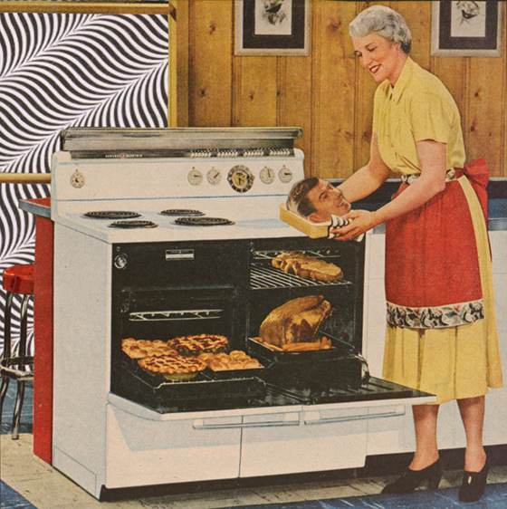 With a smile as sweet as pie and a severed head cradled like a roast, this suburban matriarch delivers the punchline to a much darker joke. Set in a pristine mid-century kitchen… complete with pies, pot roast, and illusion paper seeping through the window. You Wouldn’t Lie to Me Would You? exposes the grotesque underbelly of performative domestic bliss. The woman's demeanor is pleasant, even loving, as she prepares to slide his head into the oven beside a feast of empty comforts.